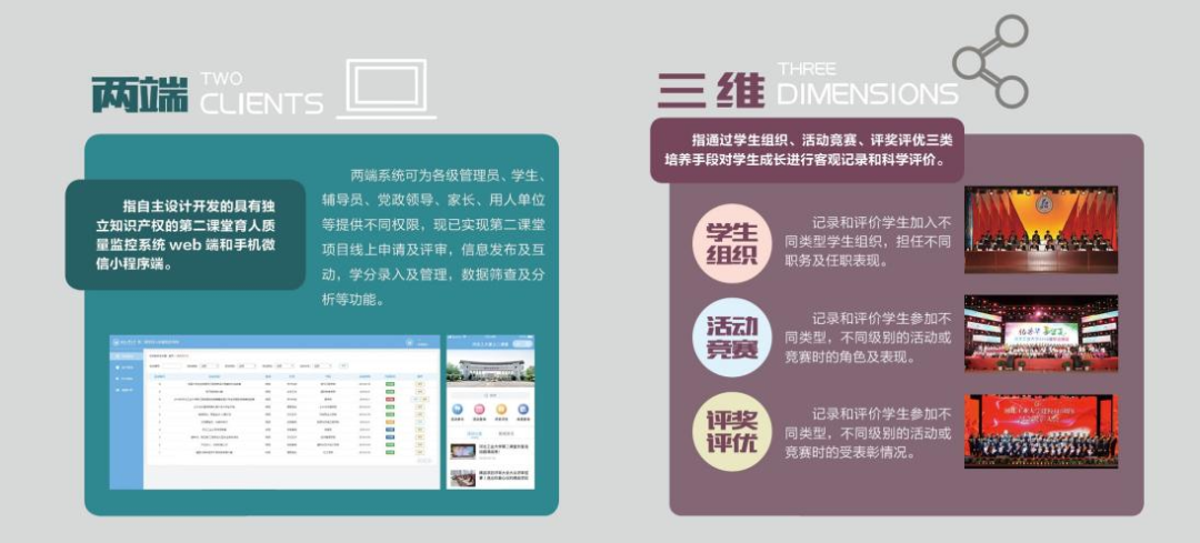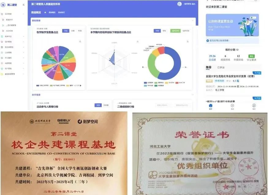 校團委迭代更新了具有自主知識產權的“第二課堂育人質量監控系統V2.0”,完成了與學校教務、學工、人事等系統數據互聯互通,建立起高效便捷的數據信息體系,并已開通企業用戶端口,吸引華為、騰訊、京東方、吉利等百余家企業合作項目近200項。搭建了“兩端三維六面”育人體系,構建起學生參與第二課堂課程項目過程和結果的成長軌跡,最終形成科學、全面、客觀的“第二課堂成績單”,為四屆2.1萬名畢業生生成完整的第二課堂成績單并納入學生檔案,助力學生求職深造就業。