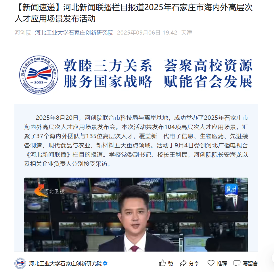 2025年8月20日,河北工業(yè)大學(xué)石家莊創(chuàng)新研究院聯(lián)合市科技局與離岸基地,舉辦了2025年石家莊市海內(nèi)外高層次人才應(yīng)用場(chǎng)景發(fā)布會(huì)。本次活動(dòng)共發(fā)布104項(xiàng)高層次人才應(yīng)用場(chǎng)景,匯聚了37個(gè)海內(nèi)外團(tuán)隊(duì)與135位高層次人才,覆蓋新一代電子信息、生物醫(yī)藥、先進(jìn)裝備制造、現(xiàn)代食品與農(nóng)業(yè)、新材料五大重點(diǎn)領(lǐng)域?;顒?dòng)于9月4日受到河北廣播電視臺(tái)《河北新聞聯(lián)播》欄目的報(bào)道。學(xué)校黨委副書(shū)記、校長(zhǎng)王利民,河創(chuàng)院院長(zhǎng)安海龍以及相關(guān)企業(yè)負(fù)責(zé)人分別接受采訪。