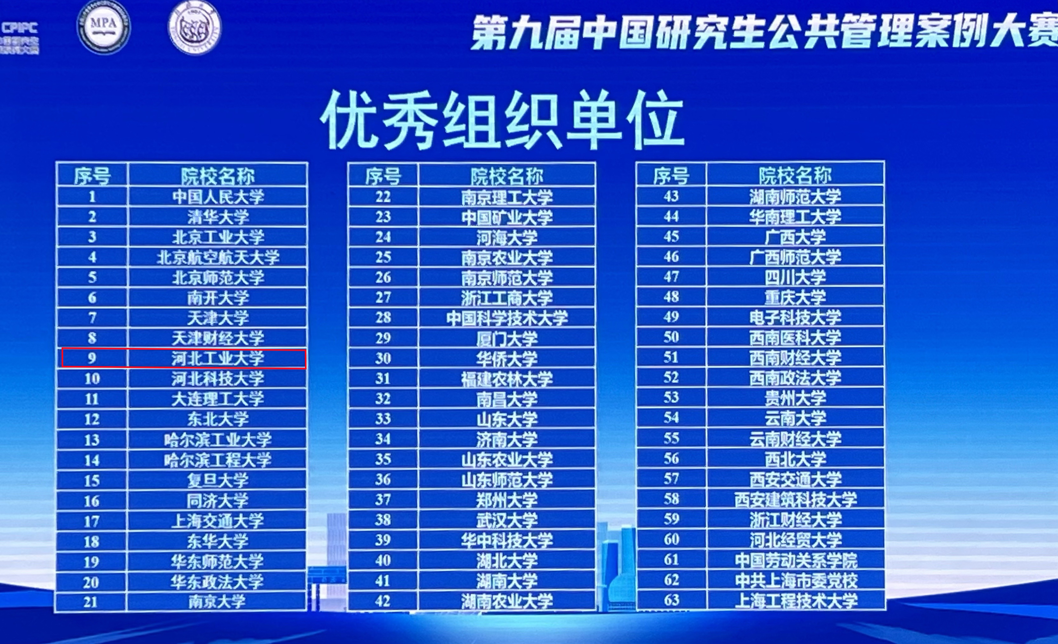 此次比賽中,河北工業大學組建了20支隊伍參賽。其中,文法學院董瑤、王新萍、許春秋、陳智、張晶晶5位同學組成的“緣'河'一隊”案例《從“百年漁村貧民屋”到“魚翔淺底生態園”:內河水域治理何以實現生態秩序到心態秩序的價值創造?——以T市子牙河“水·岸共生”治理為例》憑借扎實的專業知識、出色的案例分析能力和精彩的現場表現,獲一等獎。11支隊伍的案例入圍前20%,獲優秀獎。在大賽首次設置的調研報告評獎中,2支隊伍獲得一等獎,4支隊伍獲得二等獎,6支隊伍獲得三等獎。河北工業大學獲評優秀組織單位。