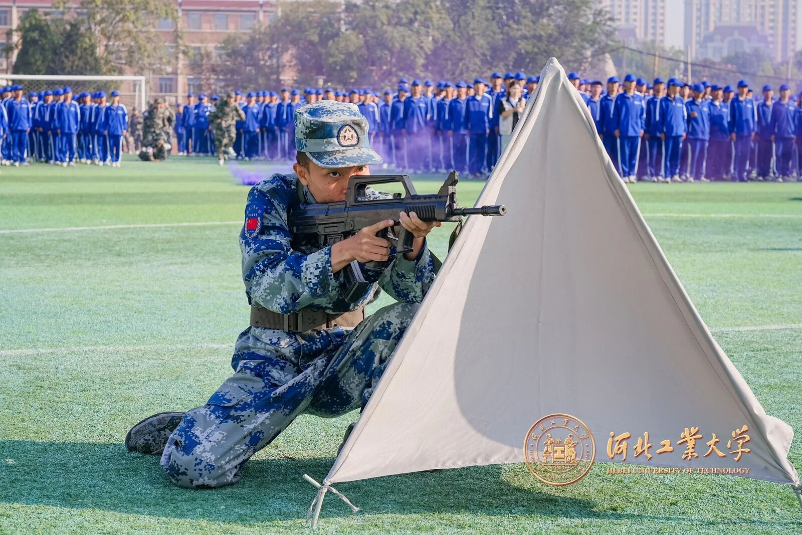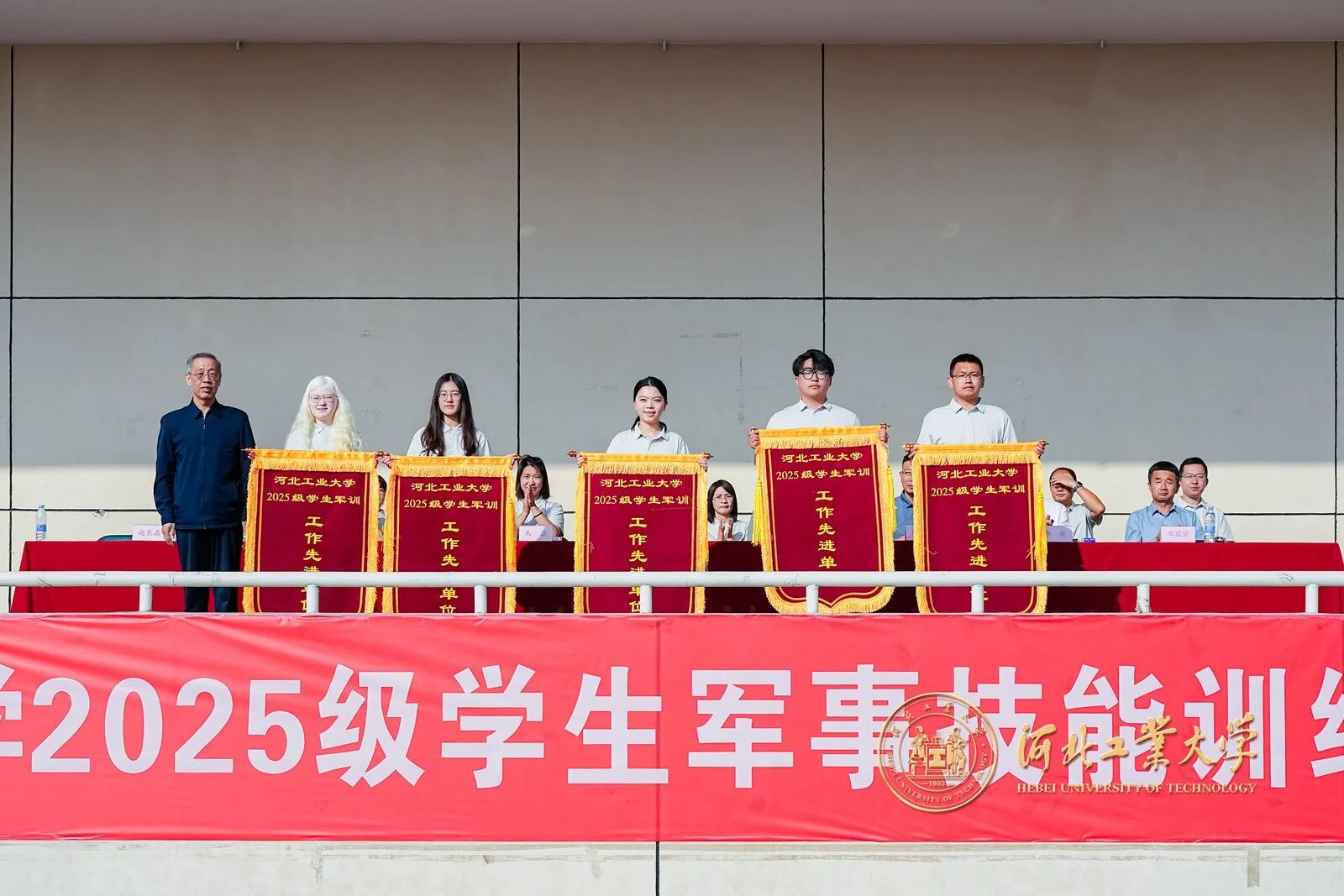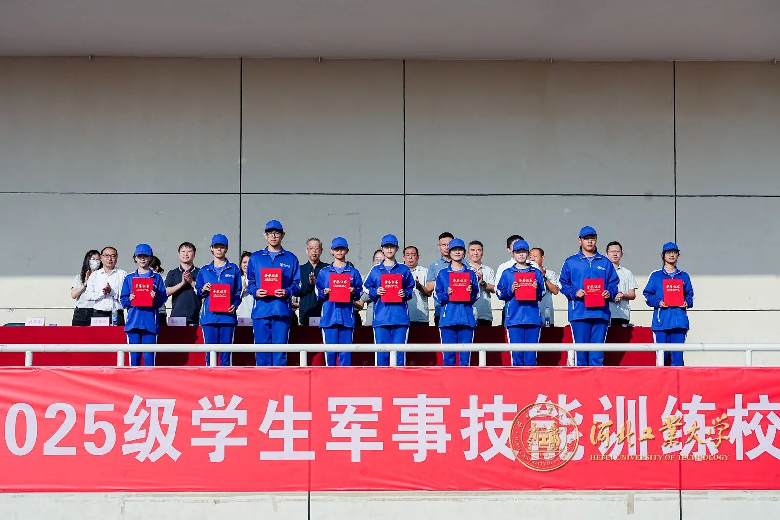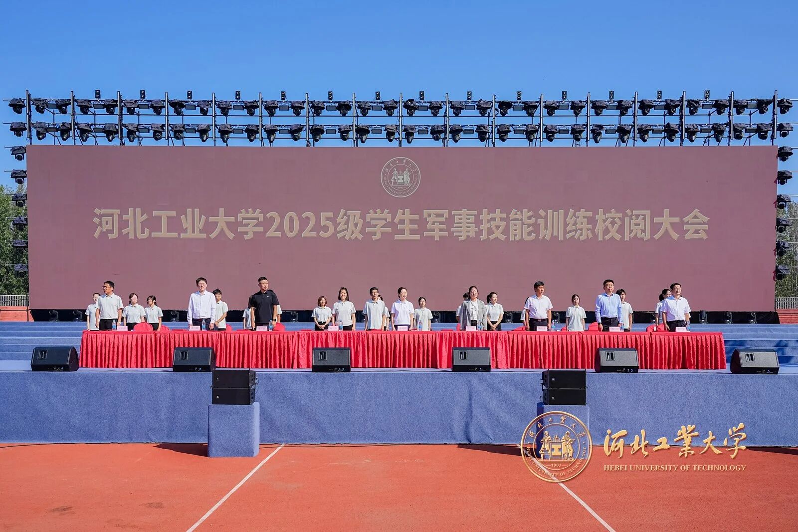 風拂征衣秋意爽,軍姿如柏氣軒昂。9月20日上午,河北工業大學2025級學生軍事技能訓練校閱大會在紅橋校區東院操場與北辰校區體育中心相繼舉行。校黨委副書記趙斌,校黨委常委、副校長陳鴻雁出席大會。校內各單位、部門負責同志,各學院軍訓工作領導小組負責人、承訓教官、2025級學生輔導員和2025級全體本科生參加大會。