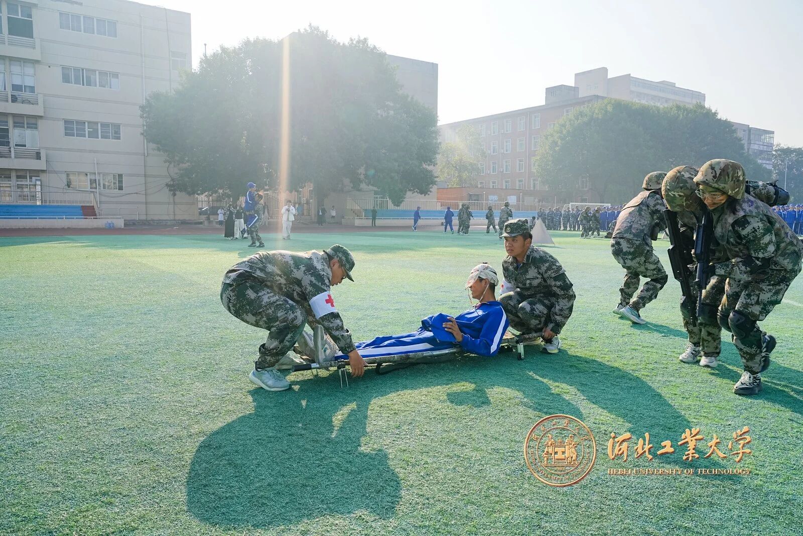 救護人員反應迅速、操作規范,熟練完成傷員轉移、急救處理等流程,既體現了軍訓的實戰化特色,也展現了學生與教官們的應急處置與協同配合能力。
