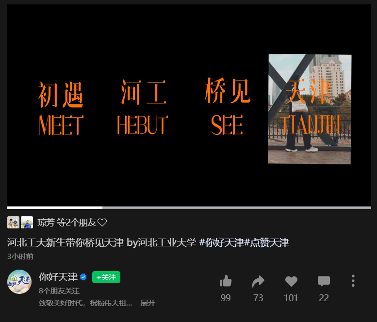 9 月 30 日,“你好 天津”平臺發布了河北工大新生帶你橋見天津的視頻,視頻拍攝了天津特色橋梁,展現了獨特的橋梁文化和城市風光。