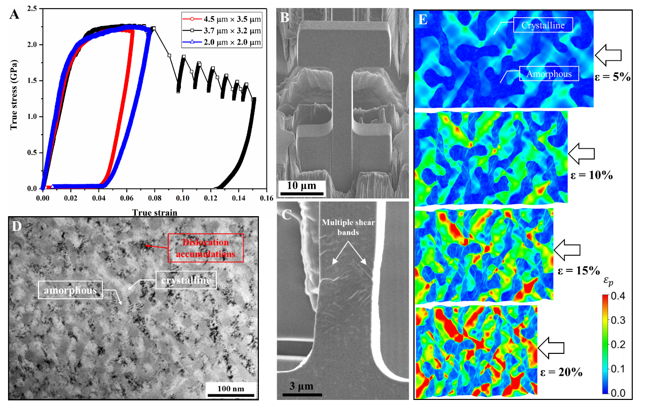 圖2. (A)TiZr基納米晶非晶復(fù)合材料的拉伸真應(yīng)力應(yīng)變曲線;(B-C)原位拉伸前后樣品的SEM圖片;(D)TEM分析和(E)有限元模擬表明塑性變形首先均勻發(fā)生在晶體區(qū)域,然后在非晶區(qū)域形成大量均勻分布的微小剪切變形區(qū)。