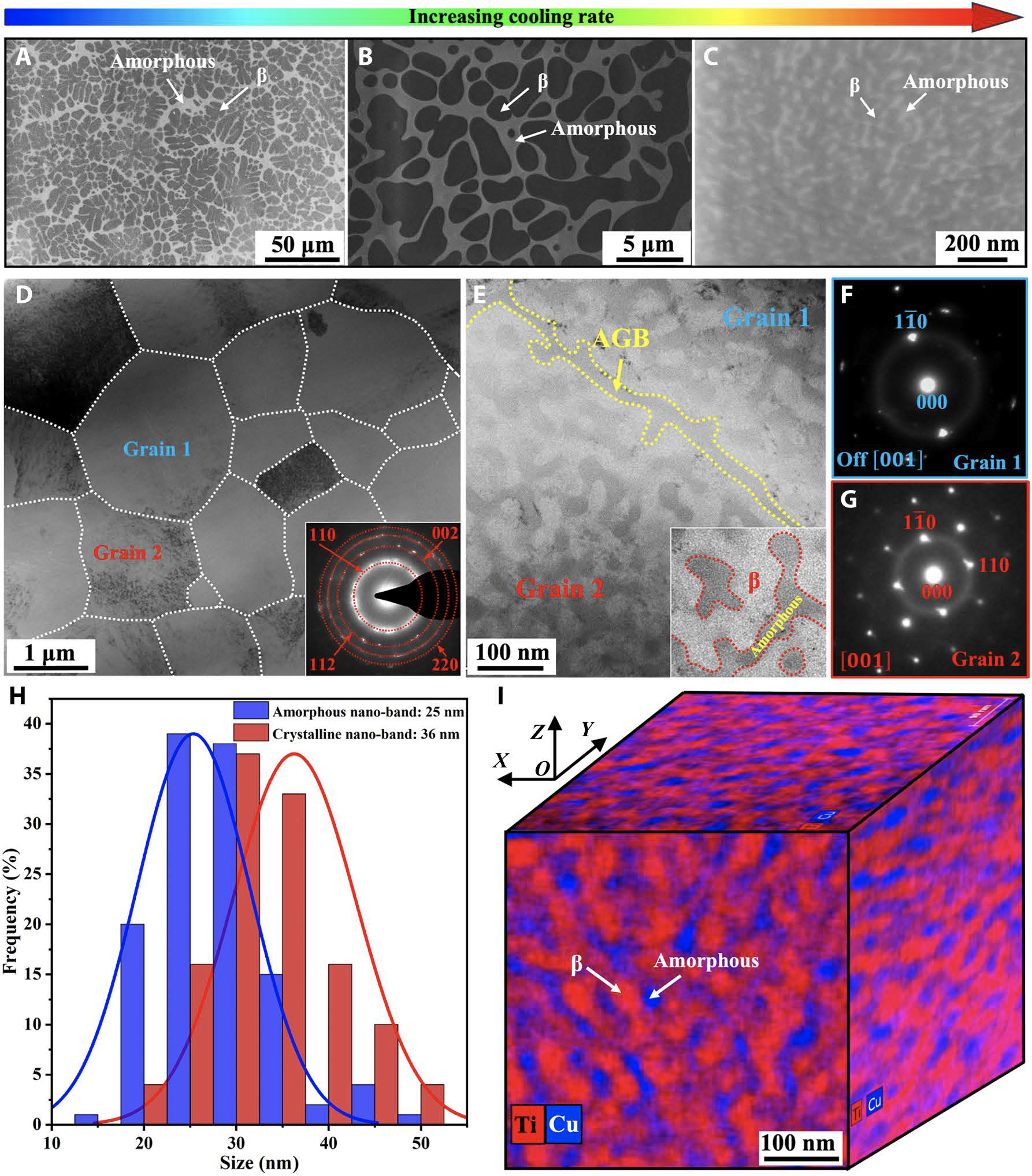 與晶體材料不同,隨著特征尺寸減小到納米級(jí),金屬玻璃的變形能力顯著增強(qiáng)。因此,由納米非晶相和晶體相組成的晶體-非晶復(fù)合材料有望同時(shí)獲得高強(qiáng)度和高塑性。作者設(shè)計(jì)了一種獨(dú)特的TiZr基納米晶-非晶復(fù)合材料,該合金由等軸的微米晶組成,且每個(gè)晶粒內(nèi)部由三維雙連續(xù)晶體-非晶納米雙相結(jié)構(gòu)(3Dbicontinuous crystalline-amorphous nanoarchitectures,3D-BCAN) 組成(圖1)。