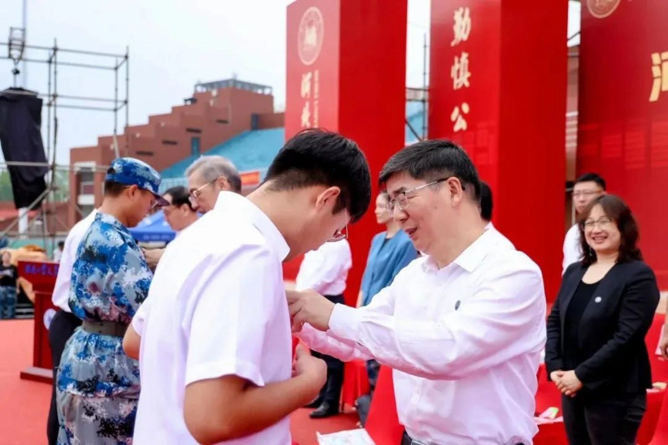 悠揚的校歌聲中,主席臺領導為學生代表佩戴校徽,臺下的同學們也將屬于自己的校徽佩戴在胸前。今天,校徽是一粒小小的紐扣,師長們幫學子扣好青春之路上的第一顆紐扣;未來,校徽是一枚閃閃的印記,承載學子青春的回憶,給予前進的動力。