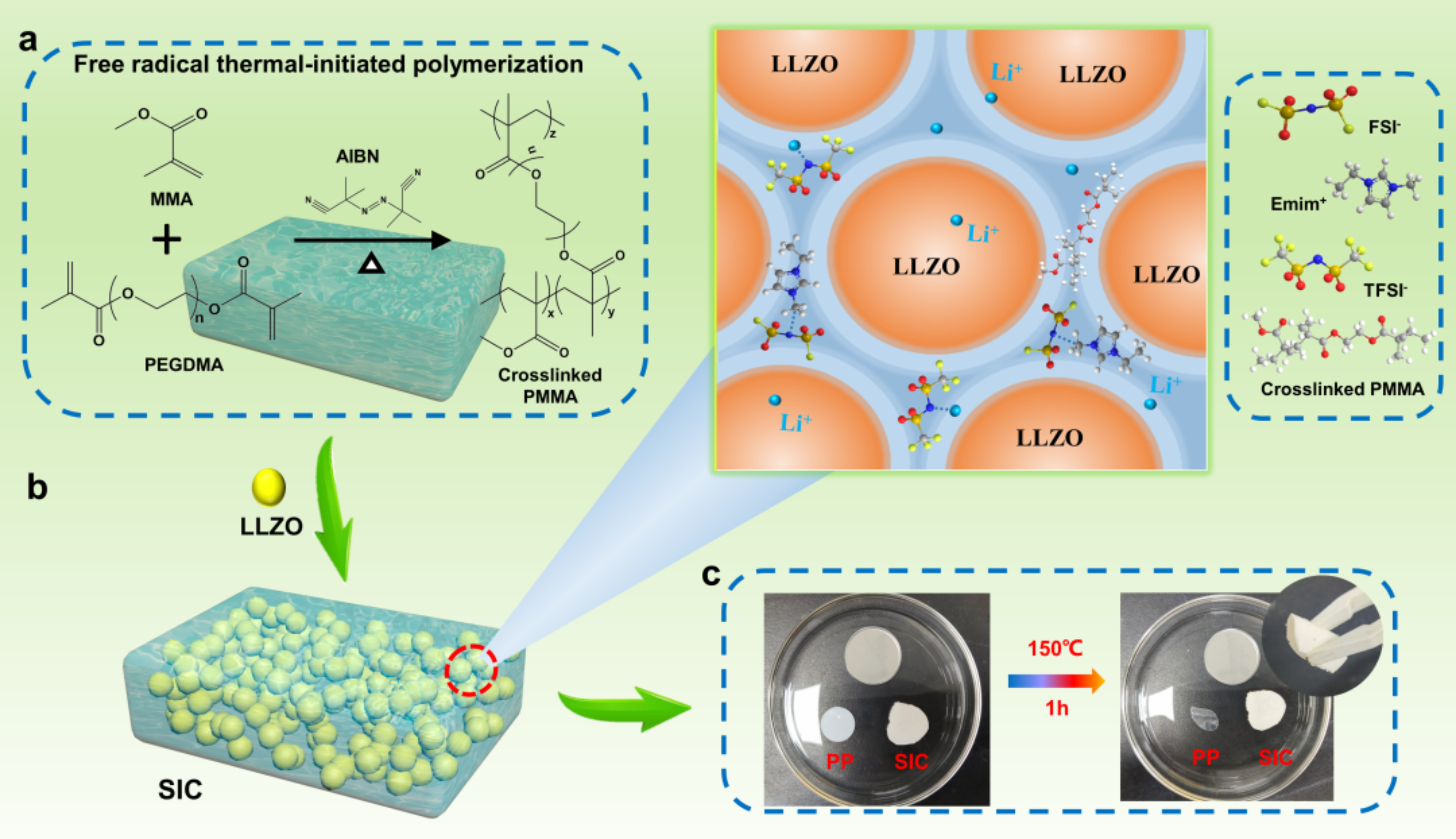 圖1 (a) PMMA自由基聚合反應. (b) SIC電解質的設計示意圖.(c) SIC電解質與商用PP隔膜的耐熱性比較.