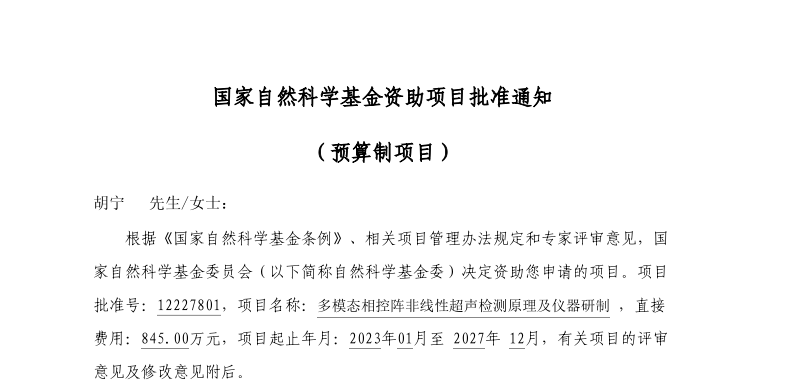 近日,由我校胡寧教授主持申報的國家重大科研儀器研制項目“多模態相控陣非線性超聲檢測原理及儀器研制”獲得國家自然科學基金委員會批準立項(批準號:12227801),項目直接經費845萬元。這是我校今年獲批的又一項重大科研項目,也是學校近年來第二次獲批重大儀器項目,展現了我校在高端儀器研制方面的巨大潛力,也是我校在新一輪國家“雙一流”建設進程中的一項標志性成果。