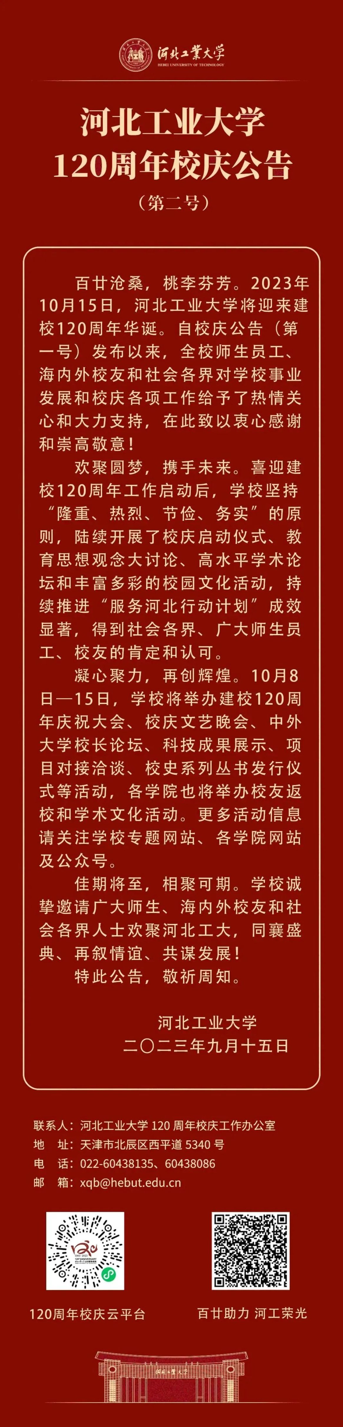 河北工業大學120周年校慶公告(第二號)