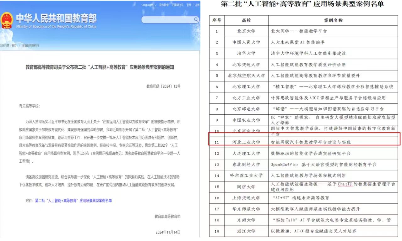 近日,教育部公布了第二批32個(gè)“人工智能+高等教育”應(yīng)用場(chǎng)景典型案例,河北工業(yè)大學(xué)案例“智能網(wǎng)聯(lián)汽車智慧教學(xué)平臺(tái)建設(shè)與實(shí)踐”榜上有名。