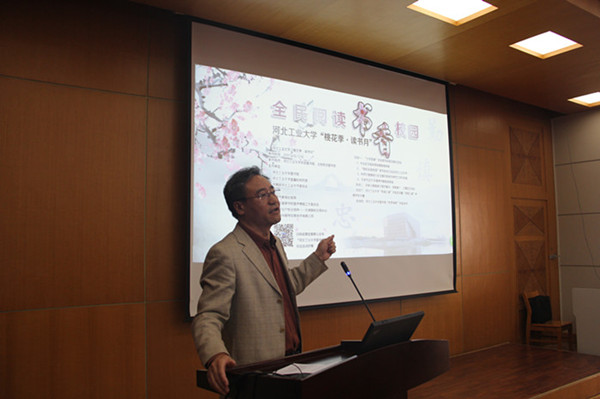 戴景新書記為“桃花季·讀書月”系列活動啟動致辭。戴書記提到,“全民閱讀”曾三次被寫入《政府工作報告》,重要程度不言而喻。而圖書館作為學校信息資源中心和文化交流中心,應在引領全校讀書風尚,創造閱讀校園氛圍上不斷發揮作用。此次聯合直屬機構黨委開展的系列活動,正是圖書館在推進學校文化建設,樹立文化自信,弘揚師生積極向上的生活態度上做出的努力。