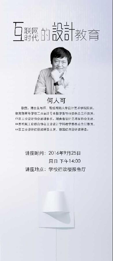 講座題目:互聯網時代的設計教育 講座時間:9月25日下午14:00 講座地點:學校行政樓報告廳 講座人:何人可 主講人簡介: 何人可,教授,博士生導師,現任湖南大學設計藝術學院院長,教育部高等學校工業設計專業教學指導分委員會主任委員,中國工業設計協會副理事長,湖南省設計藝術家協會主席,中國機械工業教育協會工業設計學科教學委員會主任委員,中國工業設計紅星獎評委主席,德國紅點設計獎評委。 歡迎廣大師生蒞臨參加!