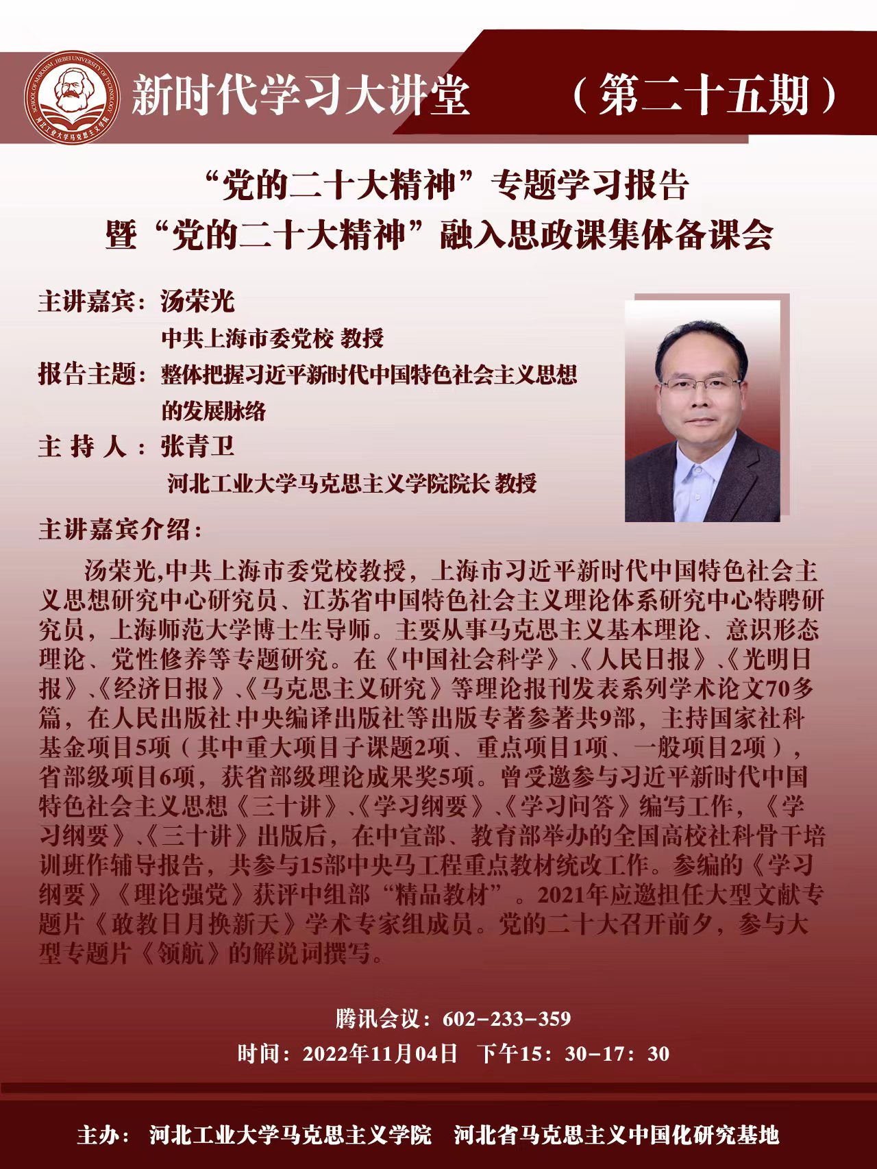 講座題目:“黨的二十大精神”專題學習報告暨“黨的二十大精神”融入思政課集體備課會——整體把握習近平新時代中國特色社會主義思想的發展脈絡