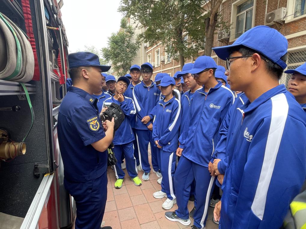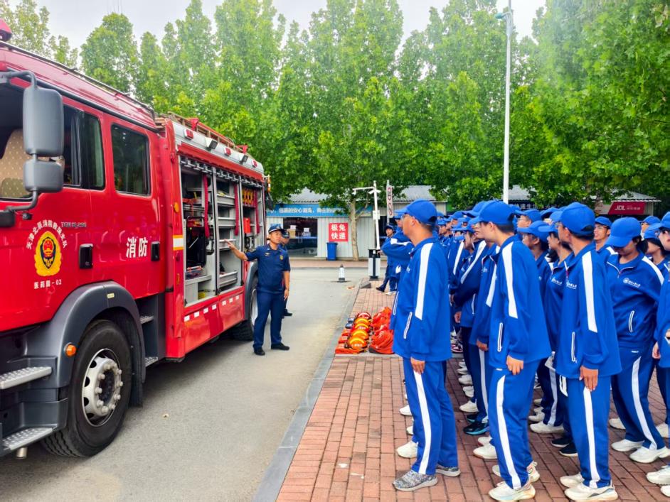 理論講解結束后,新生們列隊參與了消防裝備體驗環節。新生們有序來到消防裝備展示區,近距離參觀專業救援車輛。消防官兵打開車廂逐一介紹各類裝備的功能用途,部分新生代表親身參與裝備體驗,親手觸摸消防水帶、破拆工具等專業器材,嘗試佩戴過濾式綜合防毒面具、穿戴滅火防護服,真切感受消防裝備的專業性與實用性。